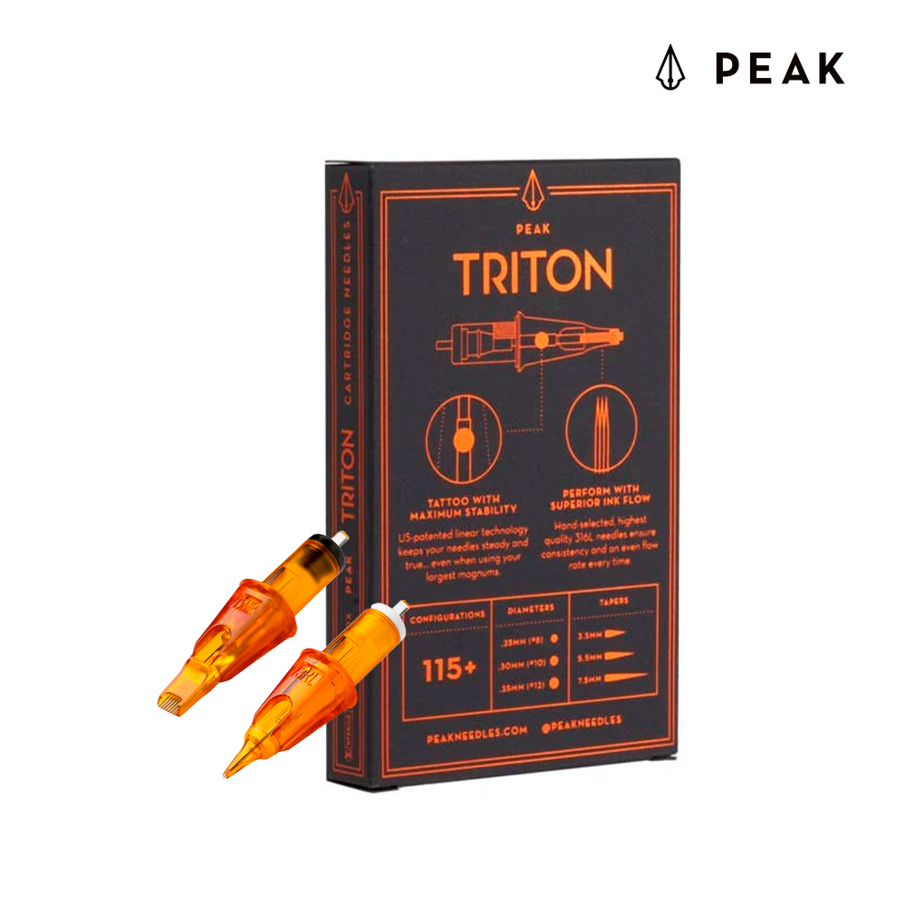 Os cartuchos Peak Triton são reconhecidos por tatuadores profissionais por oferecerem controle máximo e estabilidade. Com tecnologia linear patenteada nos EUA, eles garantem precisão constante, mesmo em grupos magnum densos.