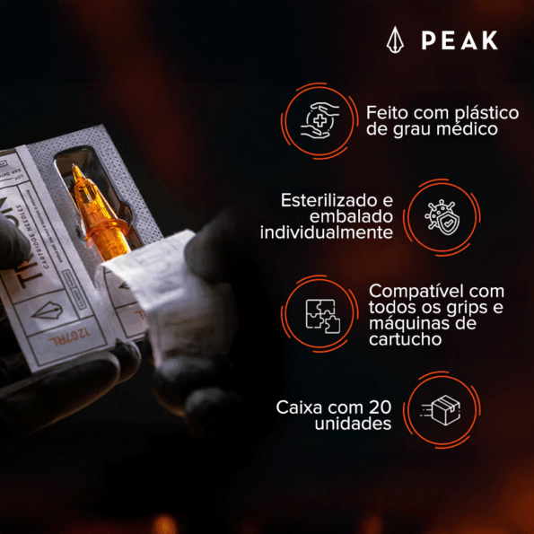 Cartucho Peak Triton com tecnologia linear patenteada, membrana anti-refluxo, agulhas em aço 316L e corpo em plástico grau médico. Caixa com 20 unidades estéreis, compatível com grips e máquinas de cartucho. ANVISA: 82151439005