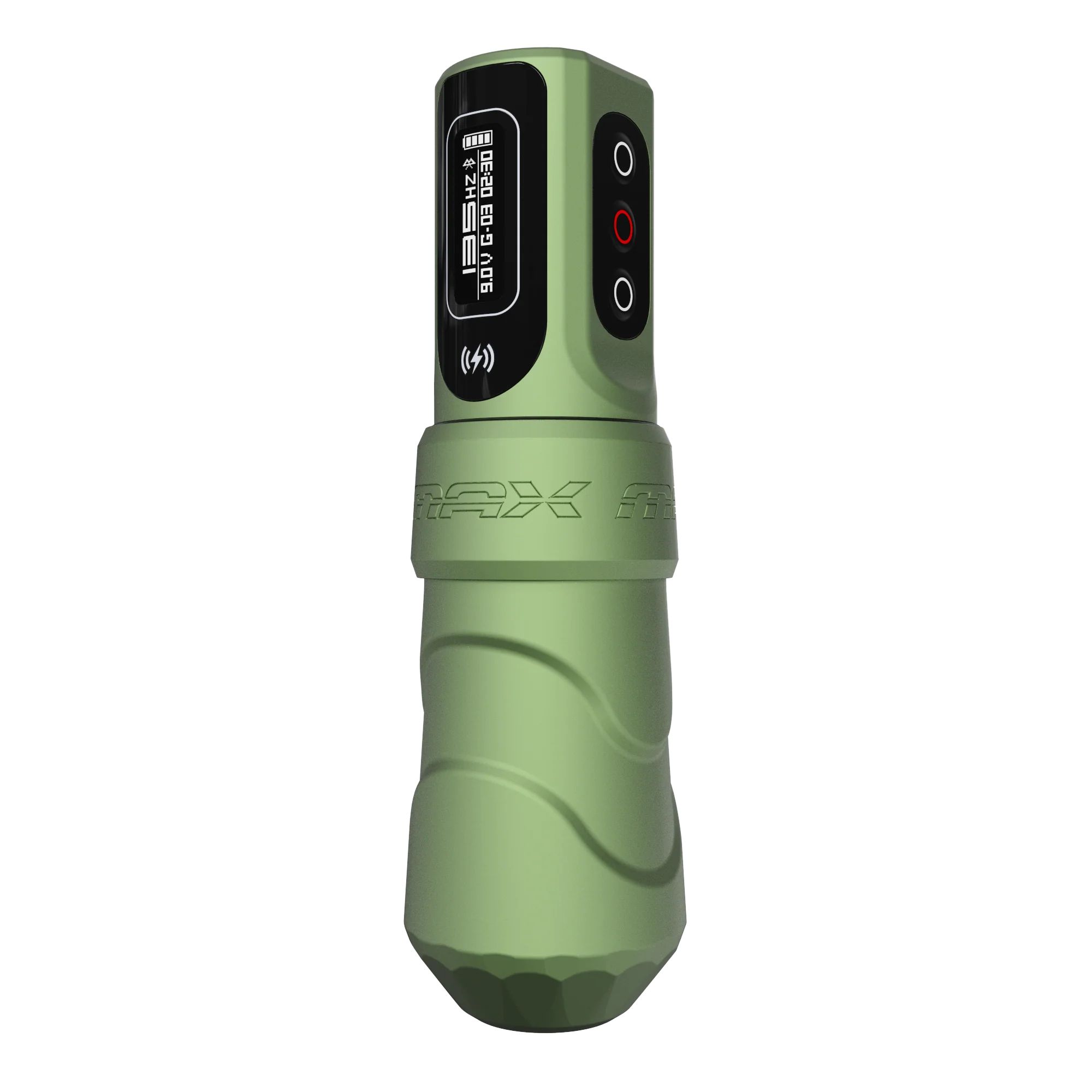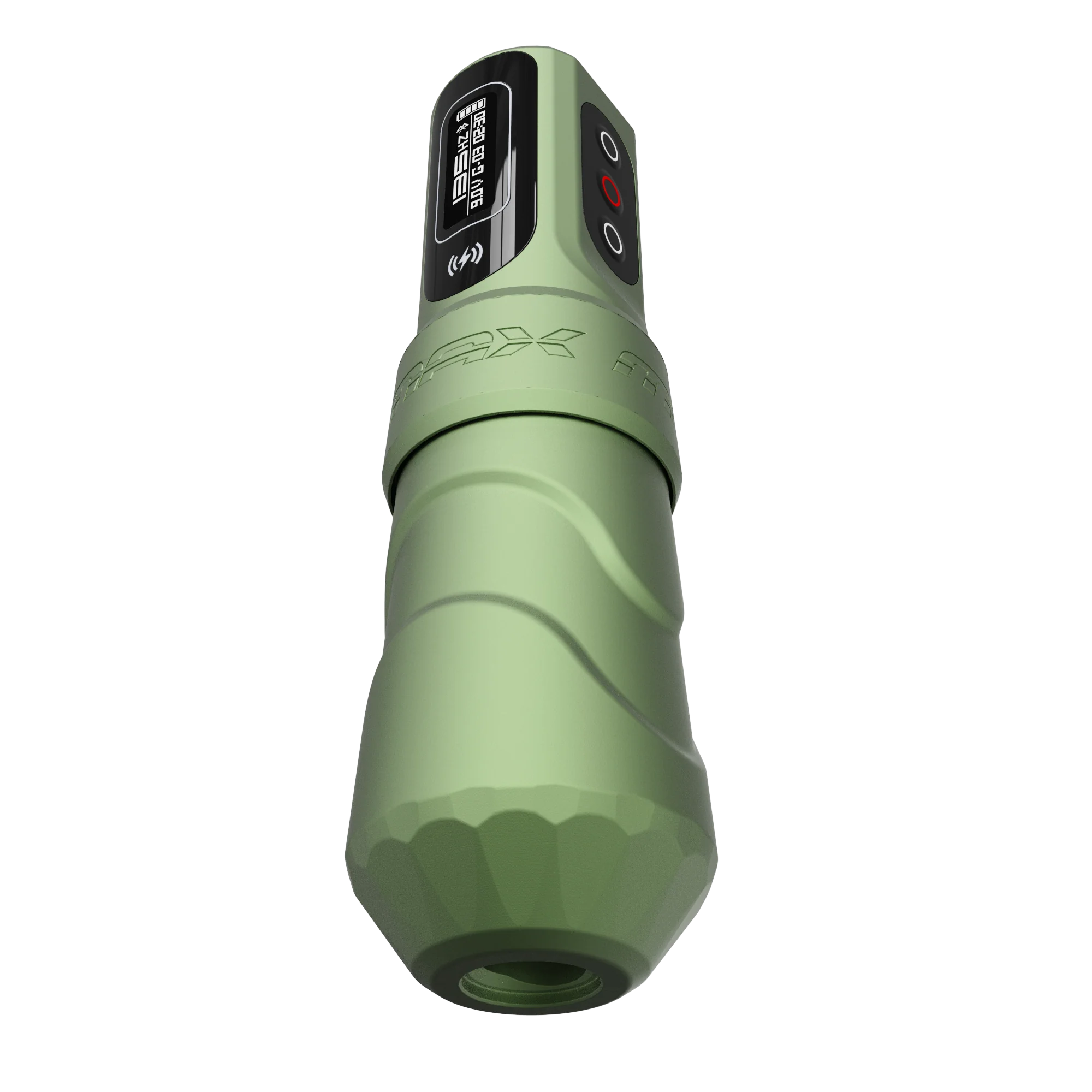 O design foi otimizado para reduzir fadiga: grip de 38 mm de diâmetro, corpo em alumínio usinado (6061 T6) e peso de cerca de 205g. Com essa ergonomia, dá para tatuar por horas sem cansar a mão.