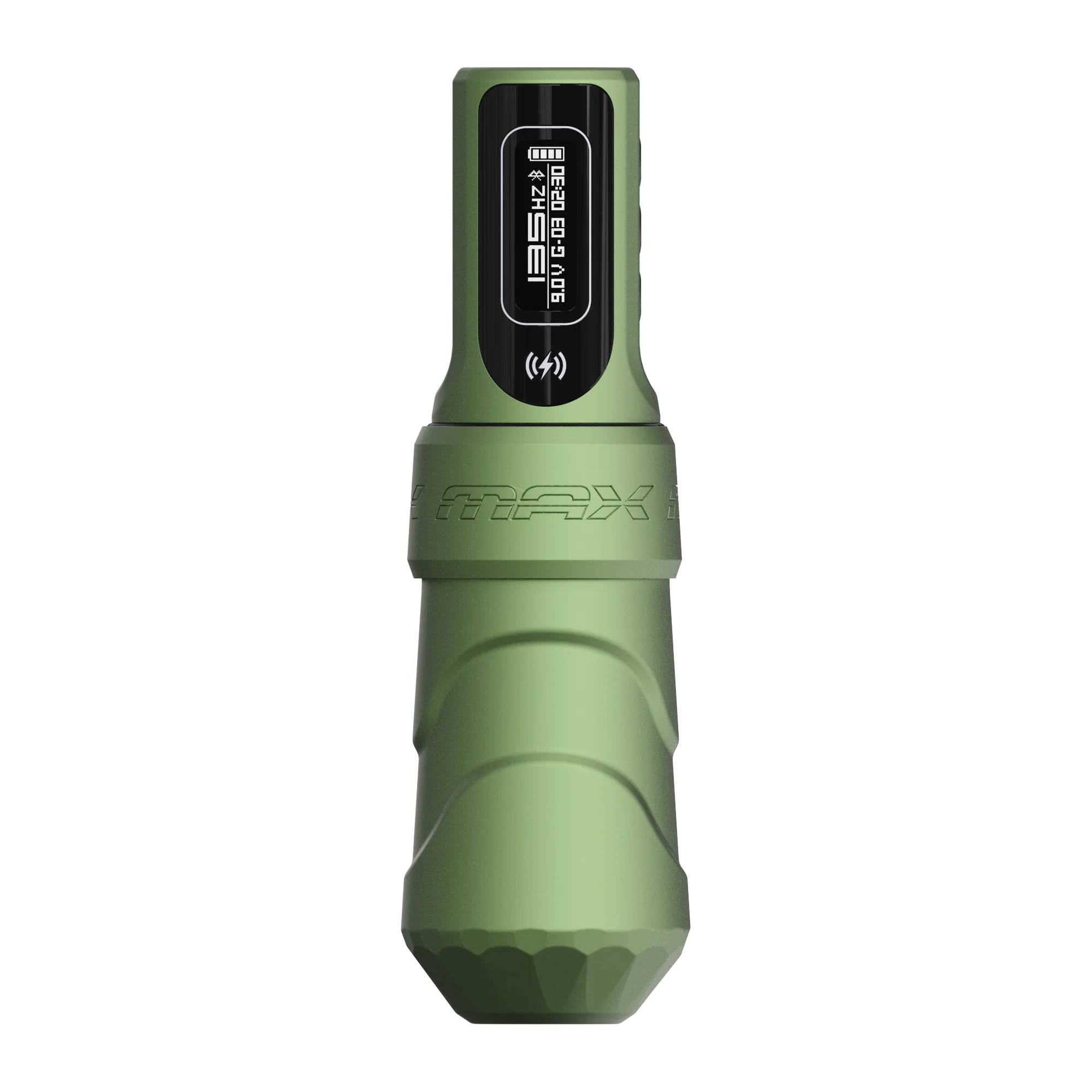 Ao contrário de muitas rotativas, a Flux Max traz um menu digital embutido por tela OLED. Você ajusta voltagem (de 4 V a 12 V), frequência (66 Hz até 199 Hz) e eGive direto na máquina — sem depender exclusivamente do app.