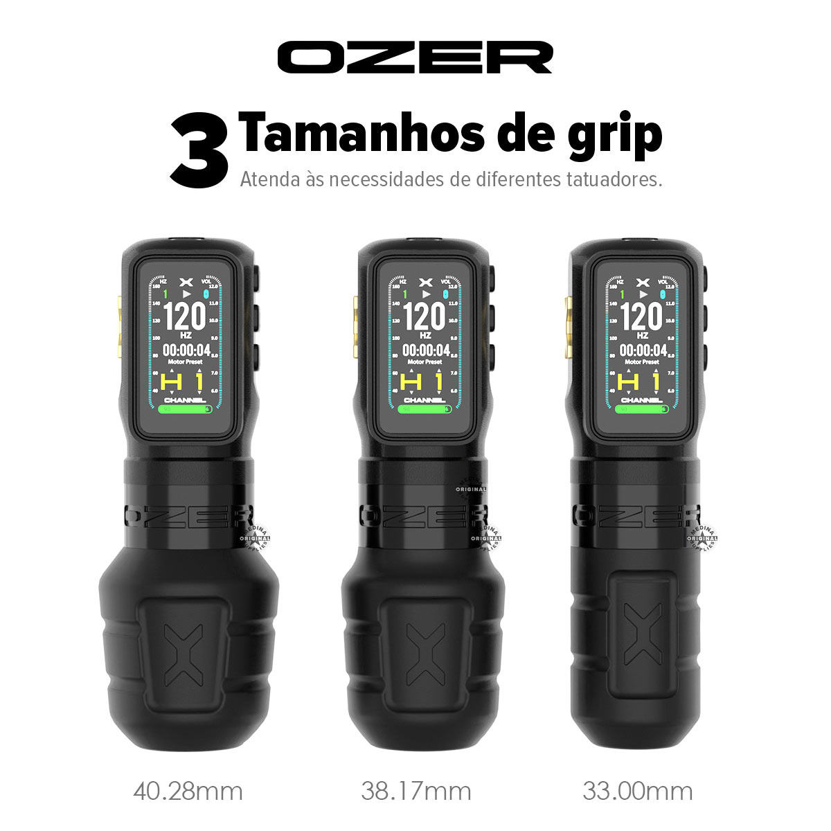 A Ozer X Channel aceita cartuchos universais. Você trabalha com as principais marcas do mercado sem adaptações. Essa compatibilidade facilita reposição e mantém liberdade na escolha de agulhas conforme técnica e preferência.