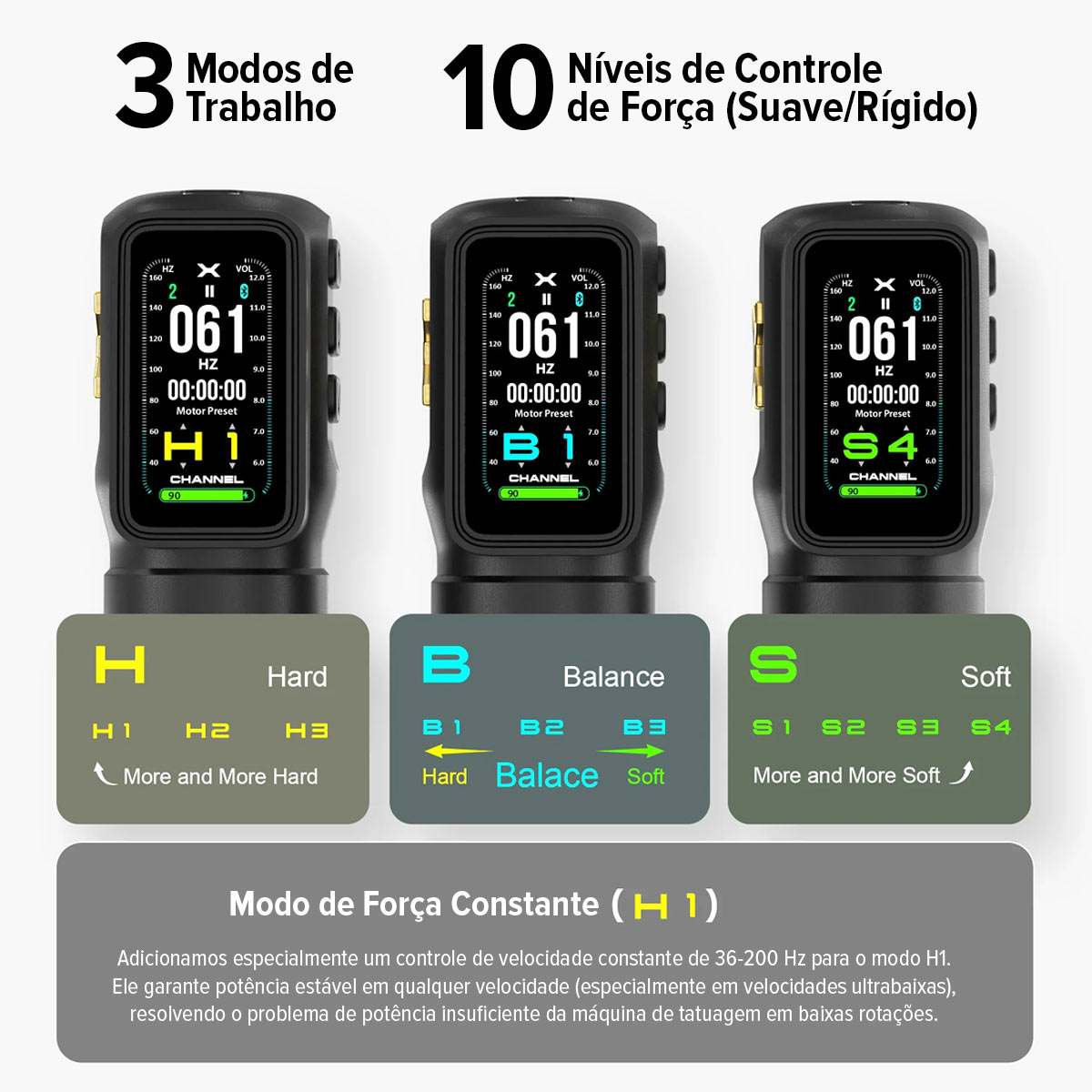 Você ajusta a intensidade de duas formas. A primeira ocorre pelo controle de frequência em Hertz, com variação dinâmica de voltagem. Essa leitura facilita encontrar o ponto ideal conforme estilo, pele e cartucho. A segunda forma ocorre por dez níveis fixos de intensidade, úteis para quem prefere repetibilidade rápida no dia a dia.
