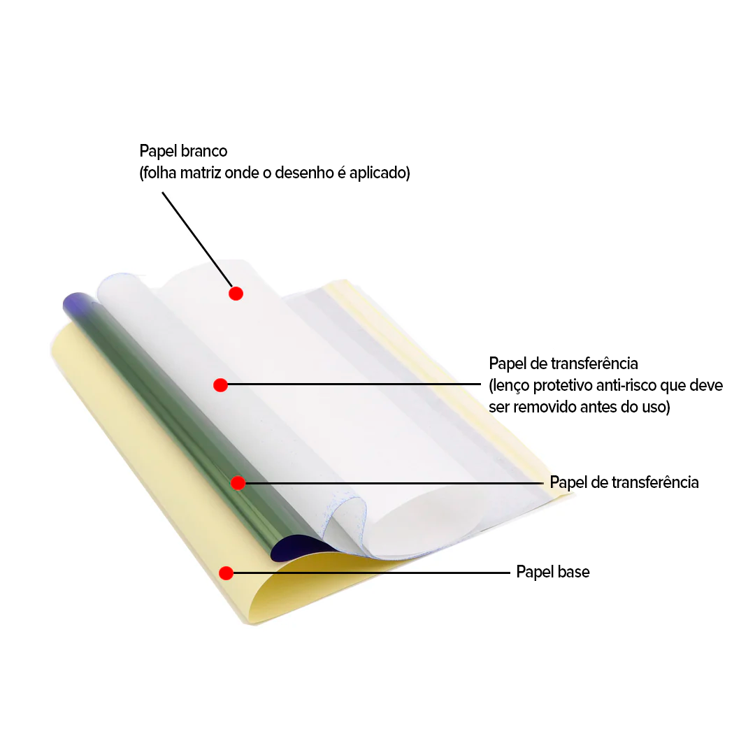 Remova a camada protetora (camada 2). Desenhe ou contorne sua arte com caneta esferográfica na camada 1. A pressão transfere o carbono para a camada de estêncil. Recorte o desenho pronto, prepare a pele com limpeza, barba e gel/creme de transferência, aplique o estêncil com pressão uniforme e retire cuidadosamente.