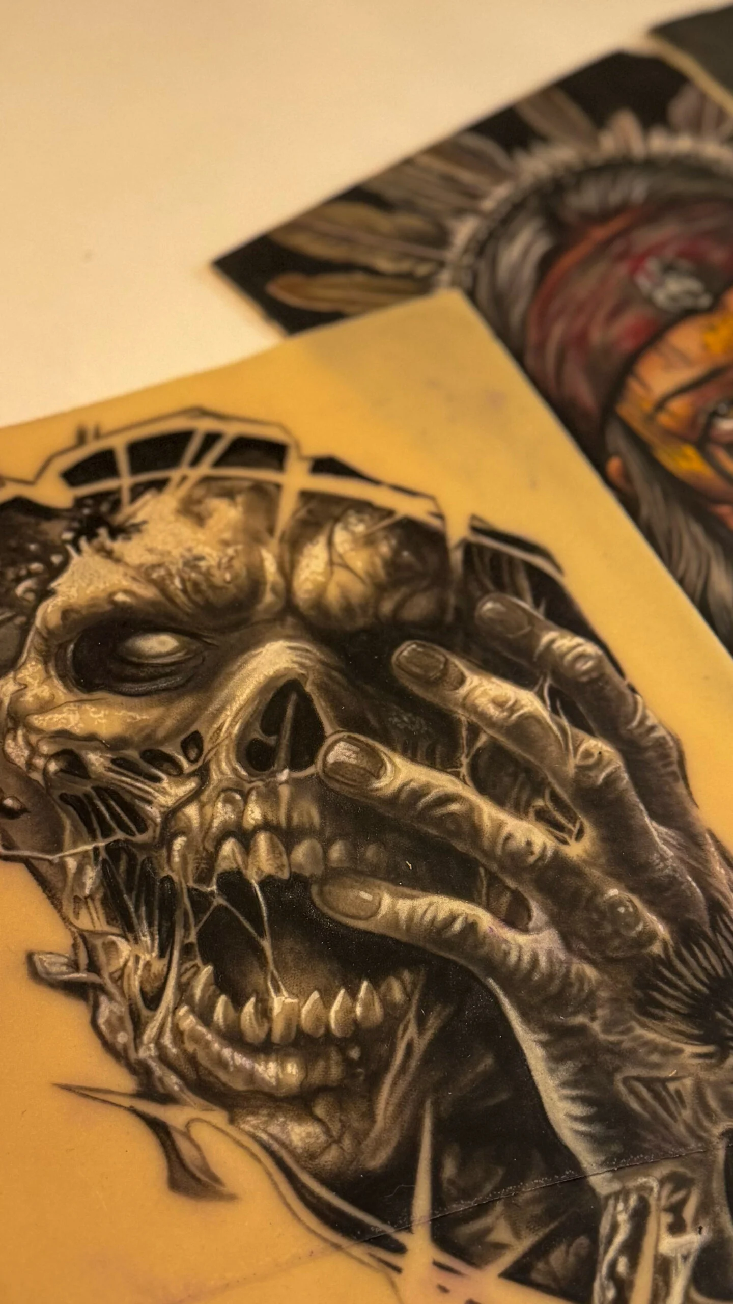 Utilize sempre o lado fosco da pele artificial. Fixe a pele em uma superfície estável antes de iniciar o treino. Aplique o estêncil normalmente e aguarde a secagem.
