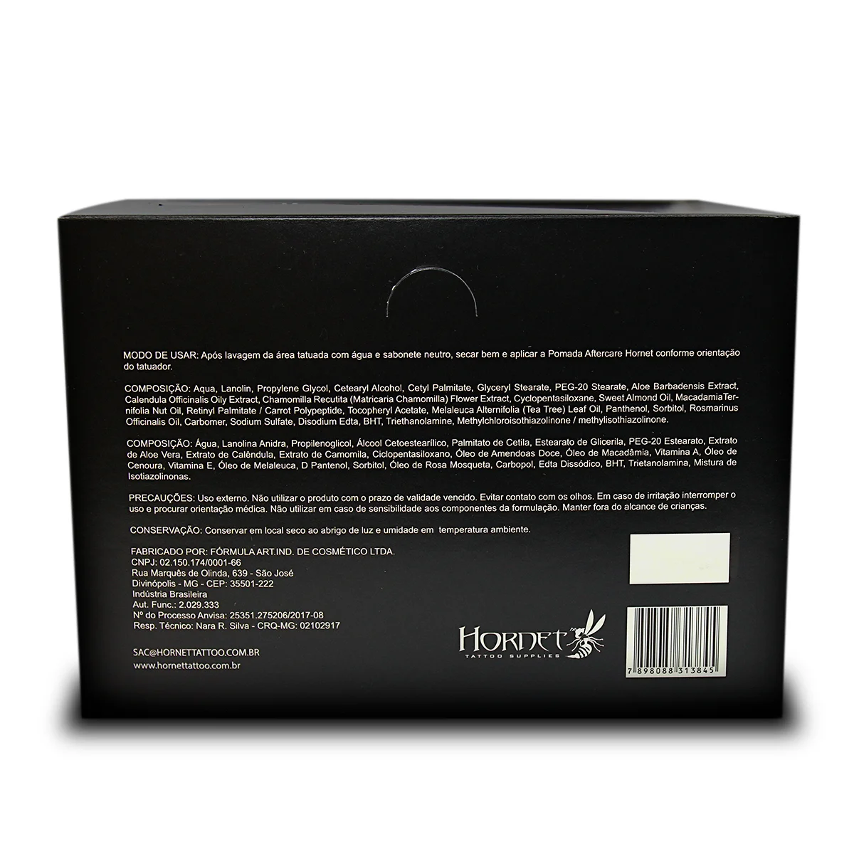 A Pomada AfterCare Hornet é um cicatrizante natural com fórmula rica em extratos vegetais e óleos essenciais. Protege, hidrata e acelera a cicatrização da área tatuada. Contém Extrato de Camomila, Calêndula, Aloe Vera, Óleo de Amêndoa Doce, Macadâmia, Melaleuca e Alecrim. Tubo de 15g. Disponível em unidade e em caixa com 20 unidades.