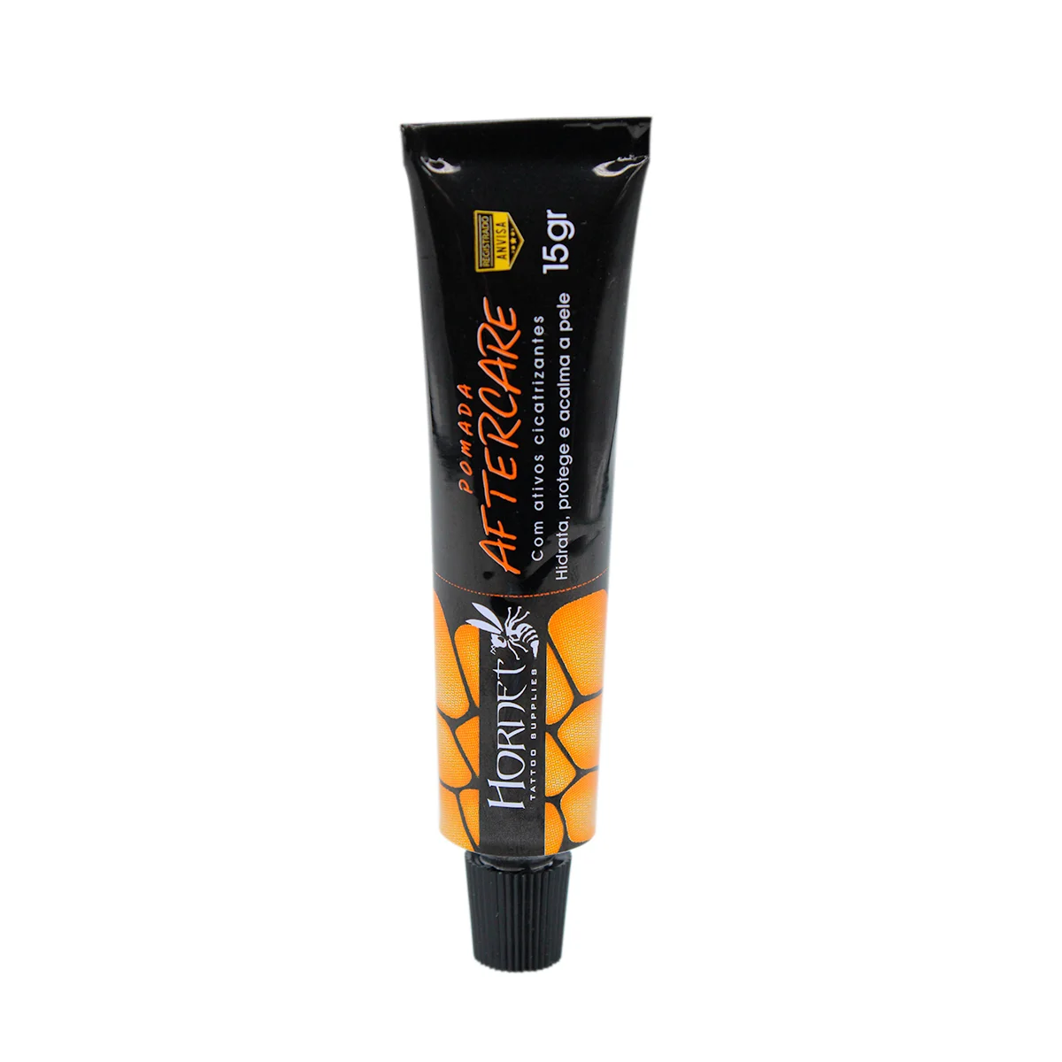 A Pomada AfterCare Hornet está disponível em tubos de 15 gramas. O tamanho é pensado para uso individual por sessão, o que facilita a entrega ao cliente como parte do kit de cuidados pós-tattoo do seu estúdio. Também disponível em caixa com 20 unidades, para quem trabalha em volume e quer manter o estoque sempre abastecido.